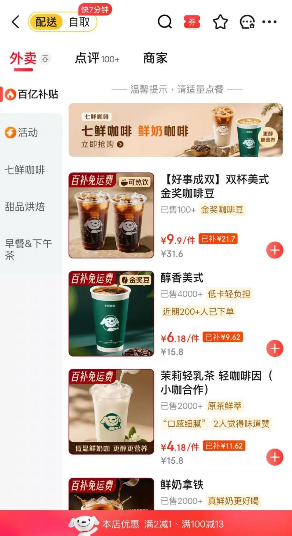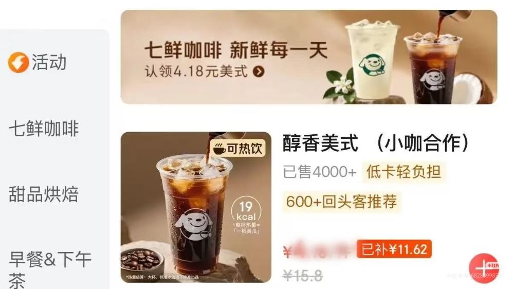 价格是七鲜咖啡的第一把利刃。原价16元的美式咖啡,百亿补贴后仅需4元;椰青美式、茉莉花拿铁等促销价低至6.18元和7.18元,较瑞幸、库迪等品牌便宜20%-30%。这种“价格屠夫”策略,直接瞄准大众消费市场。一位北京消费者表示:“4元的美式,比自己冲还便宜,不喝白不喝。”
