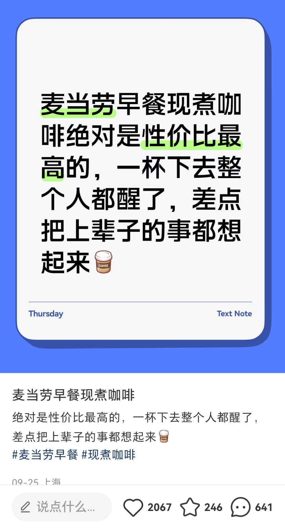 “麦当劳早餐的鲜煮咖啡绝对是性价比最高的,一杯下去整个人都醒了,差点把上辈子的事都想起来。”一位网友的发帖引发了评论区的一致认同。还有网友表示:“以前看过一个什么统计说这个咖啡是咖啡因含量最高的。”“绝对是,我一个天天咖啡的人喝了这个晚上睡不着觉。”这些评论不仅体现了麦当劳咖啡的提神效果,也反映出它在消费者心中的独特地位。