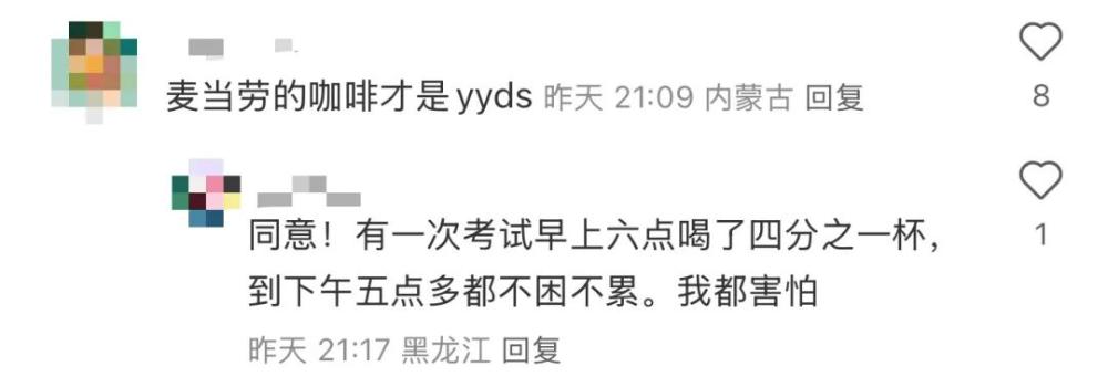 学生群体对麦当劳咖啡也不陌生。有人表示,每次早上九点上课前喝一杯,立刻感觉“超级精神”。还有学生分享了自己的经历:“有一次考试早上六点喝了四分之一杯,到下午五点多都不困不累,我都害怕。”对于上班族来说,麦当劳咖啡更是“晨间续命”的必需品。有上班族表示:“全靠麦当劳咖啡撑着,不然早上根本起不来。”