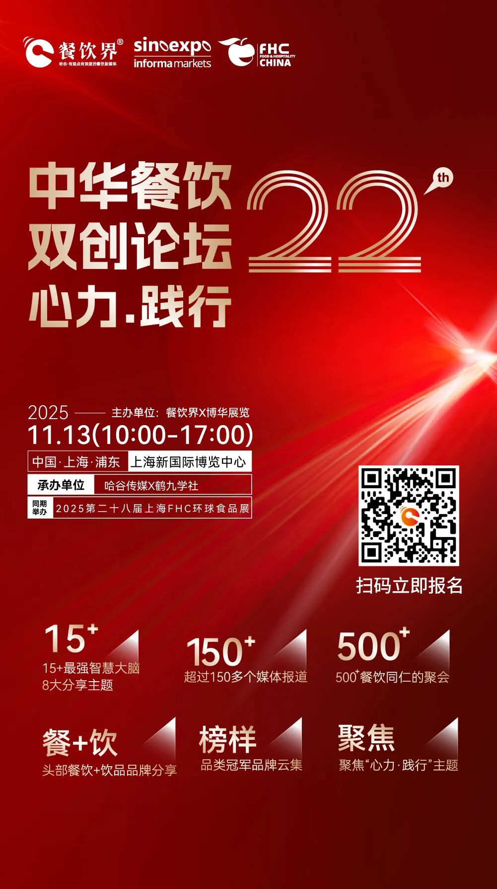 2025年11月13日,《餐饮界》新媒体将携手上海博华举办“心力·践行:第22届中华餐饮双创论坛”,大会将定向邀请超500+餐饮行业人士将汇聚一堂,一起聚焦“向内求、向外行”的“心力”与“践行”,汇聚行业最前沿的智慧、最务实的经验与最创新的力量,打造一场别具一格的餐饮知识盛宴。