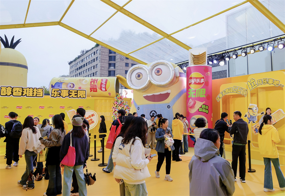 主题快闪自登陆各大城市以来,凭借萌趣的视觉设计与沉浸式互动体验,持续引发打卡热潮。步入现场,经典的乐事黄与小黄人元素交织碰撞,巨型乐事罐装置与憨态可掬的气模角色,共同营造出轻松愉悦的社交氛围。其中,互动设计紧扣“分享”主题,随处可见拉开的薯片罐和伸手可拿的薯片装置,吸引众多消费者纷纷驻足拍照。