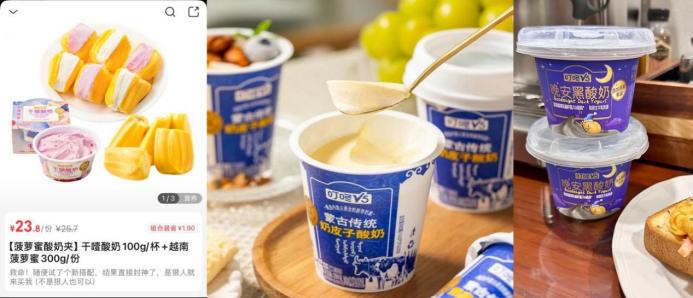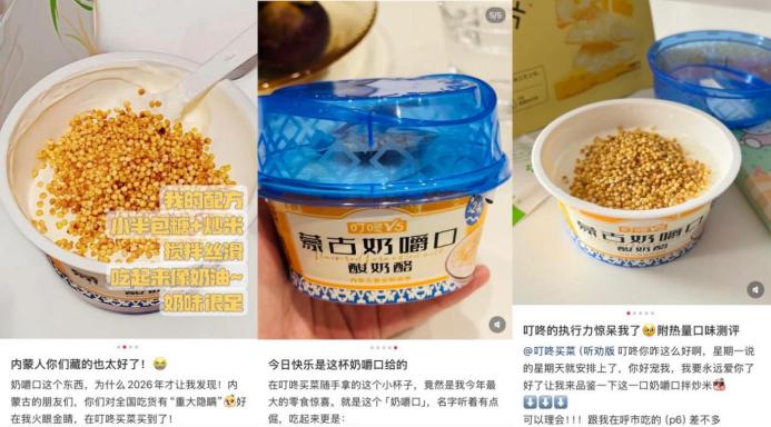 蒙古酸奶酪俗称“奶嚼口”,是内蒙古一种极具特色的传统乳制品,由酸奶自然发酵后上层凝结而成,口感醇厚微酸,奶香浓郁。在当地,它常作为“酸奶油”使用。内蒙人的早餐会用奶嚼口搭配炒米、白砂糖作为早餐食用。“叮咚V5蒙古奶嚼口酸奶酪”走红并非偶然,从去年火爆全网的干噎酸奶、奶皮子酸奶,到如今的奶嚼口,低温酸奶现在正呈现“越来越干”的新品趋势。