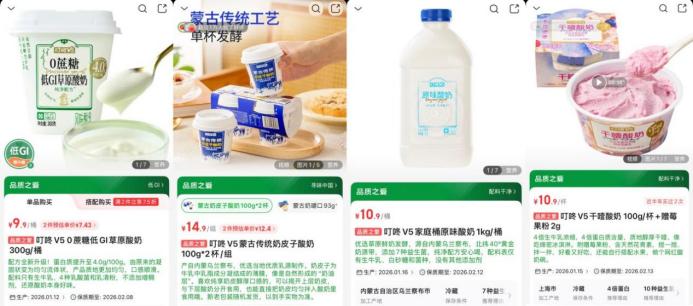 以叮咚买菜近期热销的几款产品为例,“叮咚V5干噎酸奶”凭借极致浓稠质地引发年轻人解压式咀嚼以及“噎出天鹅颈”的玩梗热潮;“叮咚V5晚安黑酸奶”添加GABA益生菌与墨鱼汁,则精准切入都市人群的睡眠焦虑,打造睡前放松仪式感;叮咚V5奶皮子系列则通过分层口感与地域文化符号,满足消费者对“新奇感+品质感”的双重期待。其中奶皮子酸奶、干噎酸奶、低GI草原酸奶等每款都成为月销百万的大单品,拉动自有品牌叮咚V5酸奶系列销售同比增长300%。可以“吃”的酸奶,成为低温酸奶品类中的增长主力军。