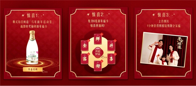 值此新春,每日鲜语在马年到来之际还焕新了蕴含美好寓意的新年限定版瓶标,将温暖的新年祝福藏于瓶身,随着饮用渐次呈现,让日常的饮用时刻充满仪式感。品牌同步启动了精心设计的“物码”新春互动:消费者购买产品后,扫描瓶身二维码,即可参与活动,赢取即时奖励与定制新年福卡,更能上传照片生成专属电子全家福。让消费者在品味高品质鲜奶的同时,也能更深度地融入新年氛围之中,亲身感受“出发向更高”所蕴含的活力与惊喜。