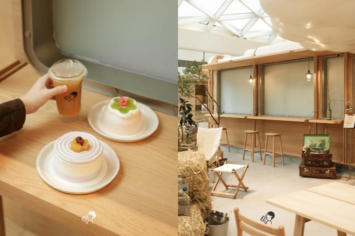 这家店的空间主题是“云上”。灵感来自喜茶经典产品“芝芝云顶”,在门店场景内融⼊云朵、餐车、茶箱和草垛等设计,也暗合了cake lab蛋糕松软的质感。