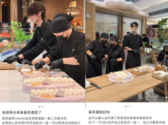 一位网友晒出了开业前门店活动中店员切蛋糕的照片,配文只有一句话:“喜茶蛋糕好帅啊。”