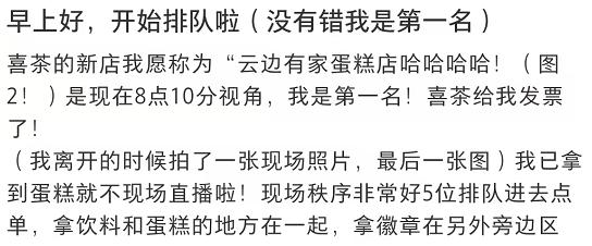 “早上八点十分,我在喜茶排队抢蛋糕。”