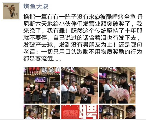 员工都是有虚荣心的,所以我一般发奖金的时候,都喜欢在店面发现金。奖励就要大声说出来,“明目张胆”地公示出来。这样,不仅员工开心,隔壁餐厅员工都愿意加入,对于后期招人也是有好处的。
