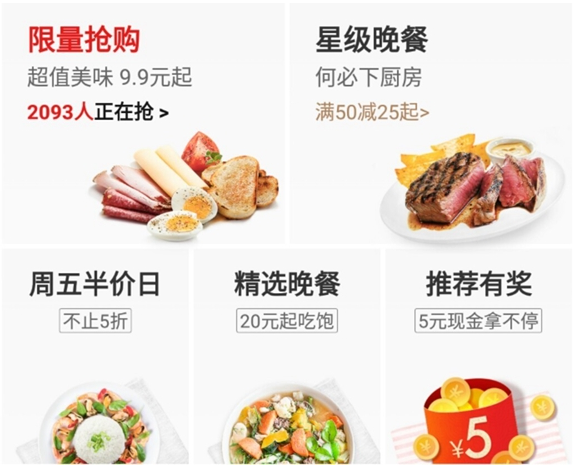 周三半价集结了开屏推送、banner和首页最大瓷片位三大曝光资源,能够带来非常可观的流量,建议主打白领午餐的商户积极参与。限时抢购竞争相对较小,下单转化率比较高,增加曝光量的同时,还能提高排名和单量,尤其适合外卖新店积累人气,老店参与推广也能培养爆款。