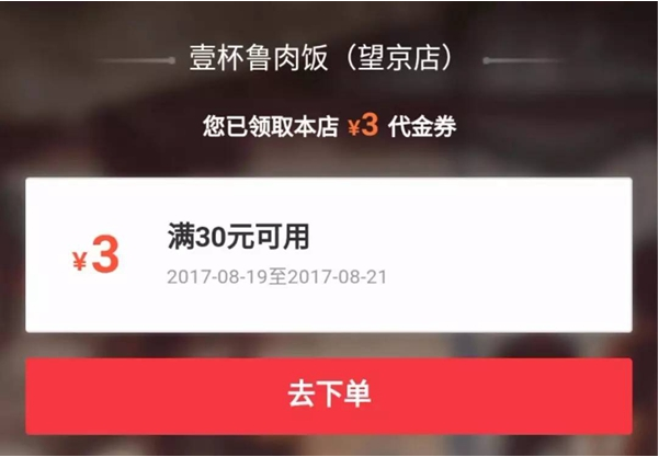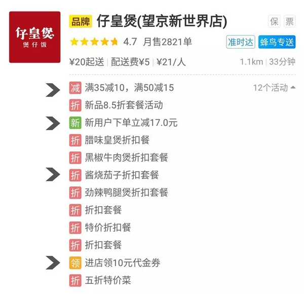 商家优惠券/代金券:能够达到引流、拉新的效果。饿了么的代金券还可设置为店内外均发放,天降券、微信分享券、领券中心、进店领券等多种形式的组合,除了吸引平台用户外,还能从微信朋友圈、好友分享等渠道引流。